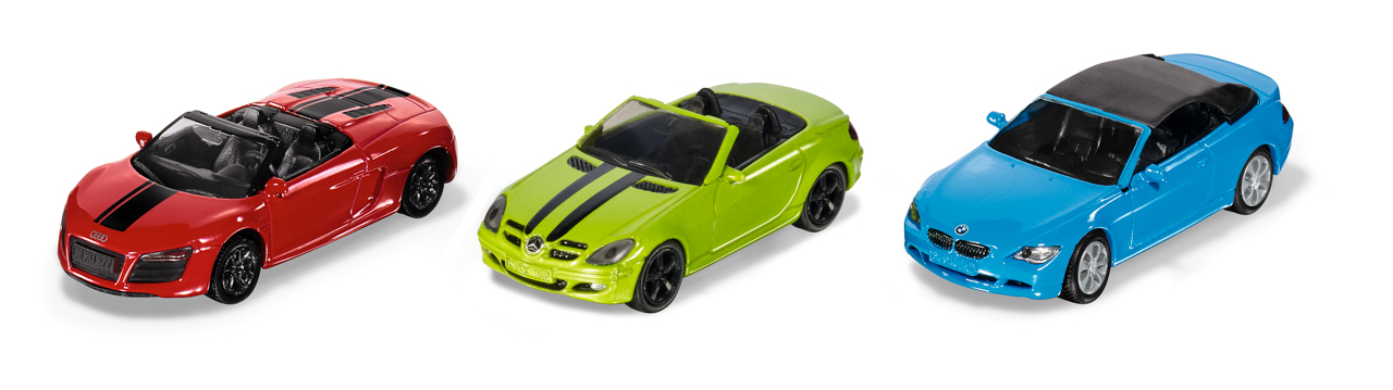 SIKU Super - set kabrioletů 3ks. Jakmile se na obloze objeví první sluneční paprsky, zažijí vášnivý řidiči kabrioletů krásný okamžik. Samozřejmě je ještě krásnější, když si můžete vybrat ze třech kabrioletů. Mercedes SLK, Audi R8 Spyder a BMW 645i. Tři vozidla různého charakteru. Mercedes je...