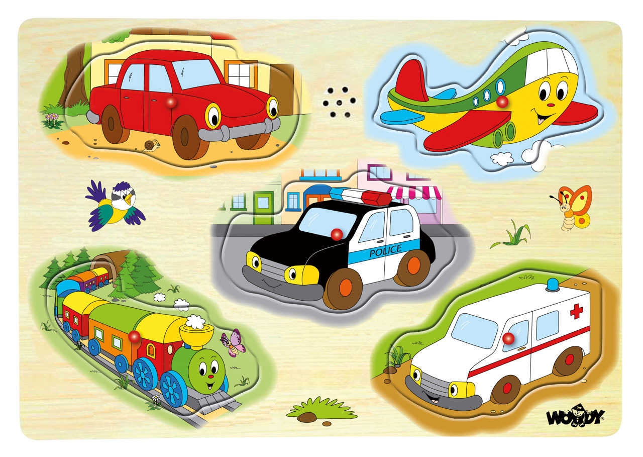 Věk: 3+ | Rozměr : 30 x 22,5 x 1,5 cm | | Zábavnou formou se dítě učí poznávat dopravní prostředky, které vydávají rozličné zvuky. Kromě toho zde opět trénuje vkládání tvarů autíčka, letadla,sanitky,vláček, policejního auta do vyseknutých forem. przeczytaj całość