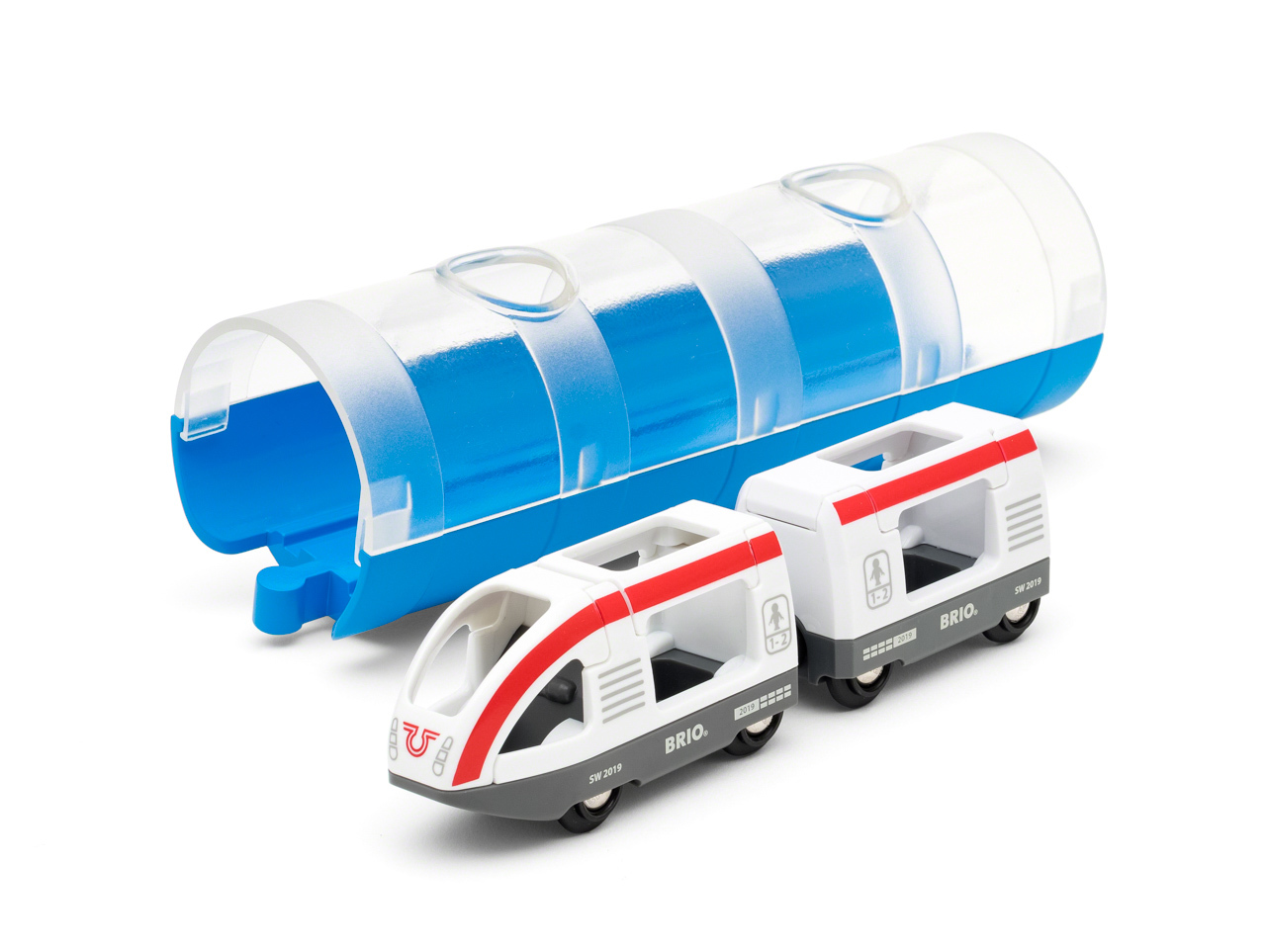 S tunelem a osobním vlakem BRIO se dostanete do nových vzrušujících destinací. Nastupte si do aerodynamické lokomotivy a osobního vozu a vezměte si sebou tři kamarády - figurky BRIO (nejsou součástí výrobku). Recyklovatelný obal, který se přemění do průhledného tunelu, vybízí ke hře, a navíc...