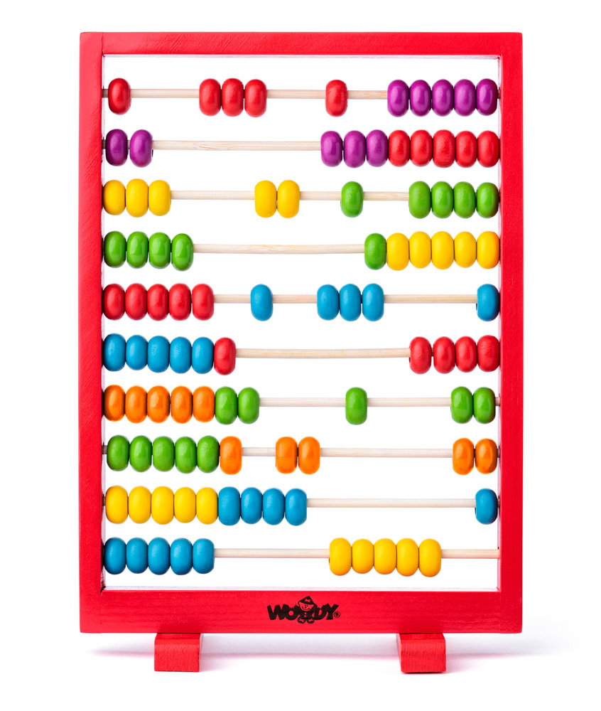 Drewniane liczydło w czerwonej ramie. Na 10 prętach nawleczono łącznie 100 koralików, które są posortowane po pięć. Zabawka jest doskonałą pomocą dla dzieci, które zaczynają uczyć się liczyć. Wymiary: 18,5 x 8,5 x 26 cm Kategoria wiekowa: 3+ przeczytaj całość
