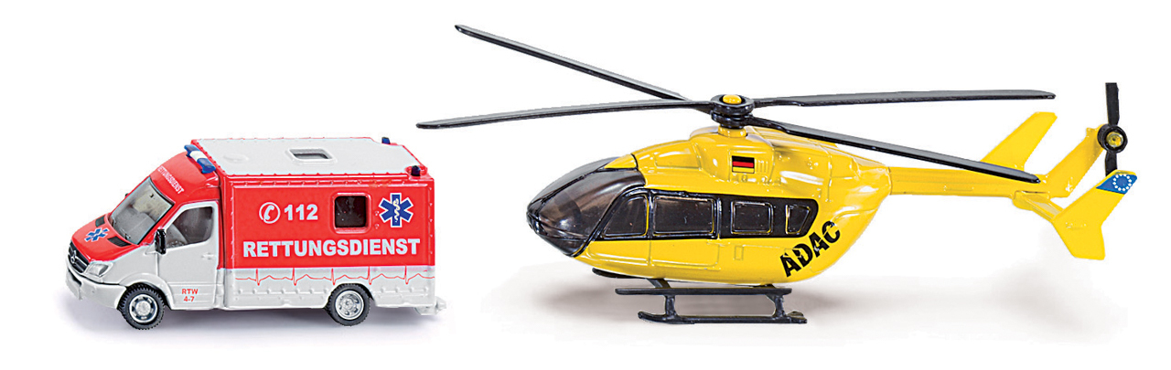 Sanitkou Mercedes Sprinter a vrtulník Eurocopter EC 145 ADAC vždy přispěchají na pomoc v nouzi. Oba modely jsou téměř celé vyrobeny z kovu a zaujmou precizními detaily. Rotory helikoptéry se mohou otáčet. Měřítko: 1:87. Rozměr: 250 x 75 x 61 mm. Rozměr balení: 25 x 6,1 x 7,5 cm. Věk: 3+ przeczytaj całość