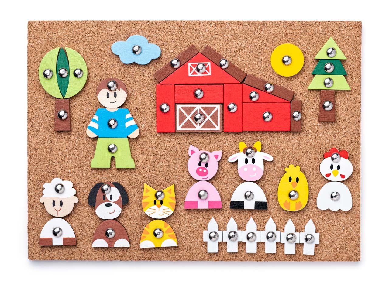 Korkowa deska z przybijanymi kształtami - Zwierzątka to idealny zestaw konstrukcyjny dla wszystkich małych twórców od 5. roku życia. Dzięki niemu dzieci mogą tworzyć nieskończoną liczbę oryginalnych obrazków pełnych zwierzątek i postaci, używając jedynie młoteczka i drewnianych gwoździ.