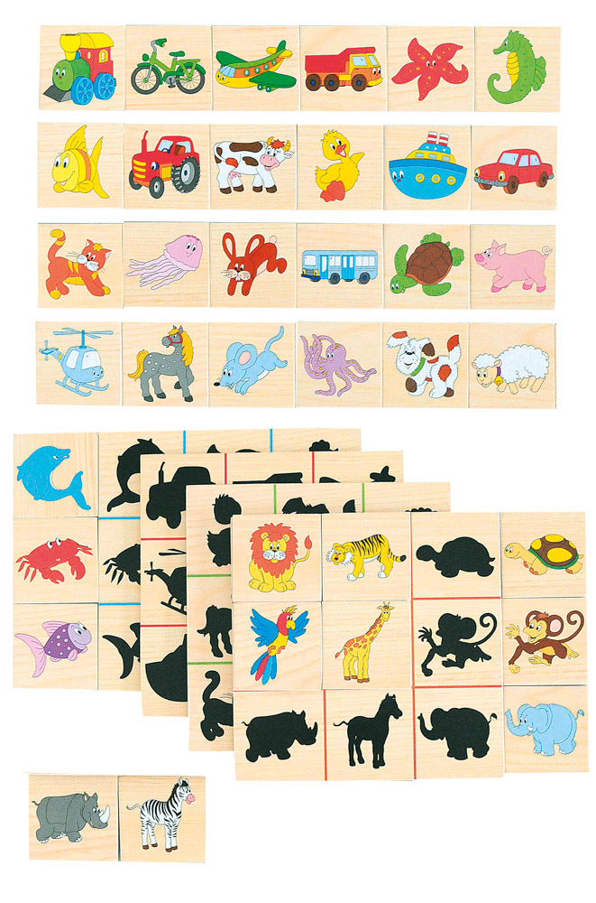 Dziecko dopasowuje płytki z kolorowymi obrazkami do ich czarnych sylwet. Całość zapakowana jest w praktyczne drewniane pudełko. przeczytaj całość
