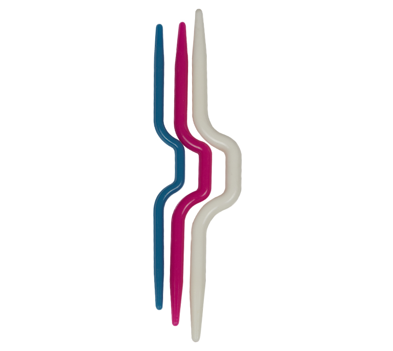 Plastové pomocné jehlice prohnuté. Na zajištění ok při pletení vzorů s křížením ok. przeczytaj całość