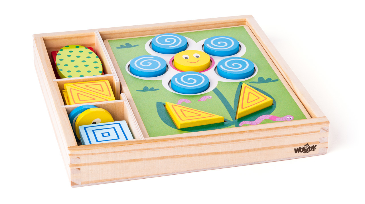 Věk: 2+ | 27x27x4 cm | Dřevěná krabička obsahuje10 destiček s obrázky. V každé destičce jsou výřezy ve tvaru geometrických tvarů. Dítě vkládá příslušné tvary do obrázku a tím rozvíjí logiku a jemnou kombinatoriku. przeczytaj całość