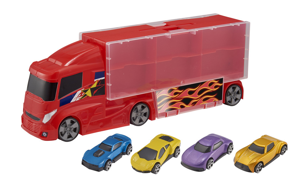 Teamsterz kufřík v designu náklaďáku. Přenosný kufřík zahrnuje 4 autíčka. Úložný prostor je celkem pro 12 aut. przeczytaj całość