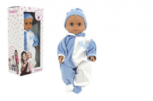 Panenka/Miminko Hamiro 40cm, pevné tělo overal modro bílý+ čepička modrá v krabici 20x43x13cm