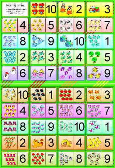 Gra przeznaczona jest dla przedszkolaków i dzieci w pierwszej klasie szkoły podstawowej i pomaga w nauce liczb oraz liczenia do dziesięciu. Gra jest podobna do domina - kartoniki po wycięciu układa się tak, aby kartonik z określoną liczbą obrazków sąsiadował z kartonikiem z odpowiednią cyfrą. przeczytaj całość