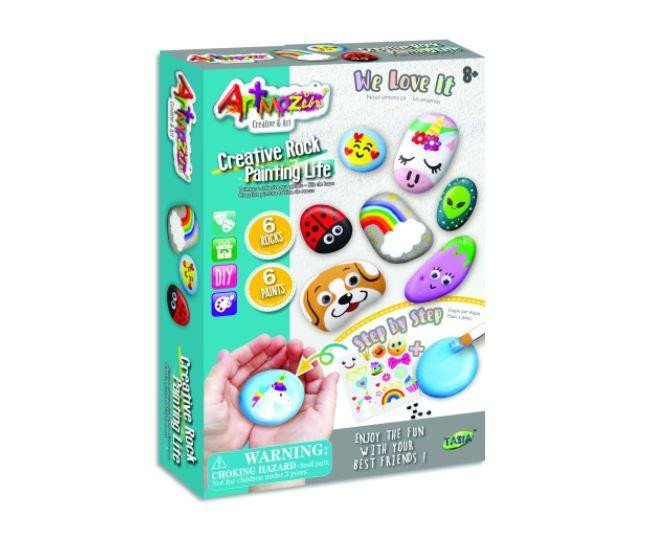 Stwórz kolorowy i wesoły kamyk. Możesz malować, przyklejać i ozdabiać według własnych pomysłów lub inspirować się motywami z pudełka. Wybierz otoczak, markerem narysuj, co przyjdzie Ci do głowy, i możesz zaczynać z farbkami. Zestaw zawiera: 6 kamyków, 6 farbek wodnych, 2 pędzelki, naklejki i marker. Wiek: 8+. Wymiary opakowania: 16,5 x 25 x 5 cm