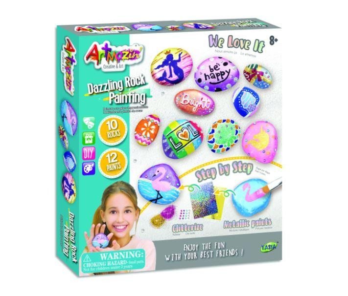 Stwórz kolorowy i wesoły kamyk. Możesz malować, przyklejać i ozdabiać według własnego pomysłu lub zainspirować się motywami z pudełka. Wybierz otoczak, markerem narysuj to, co przyjdzie Ci do głowy i możesz zaczynać z farbkami. Opakowanie zawiera: 6 kamyków, 6 x farb wodnych, 2 pędzelki, naklejki i marker. Wiek: 8+ Wymiary opakowania: 16,5 x 25 x 5 cm