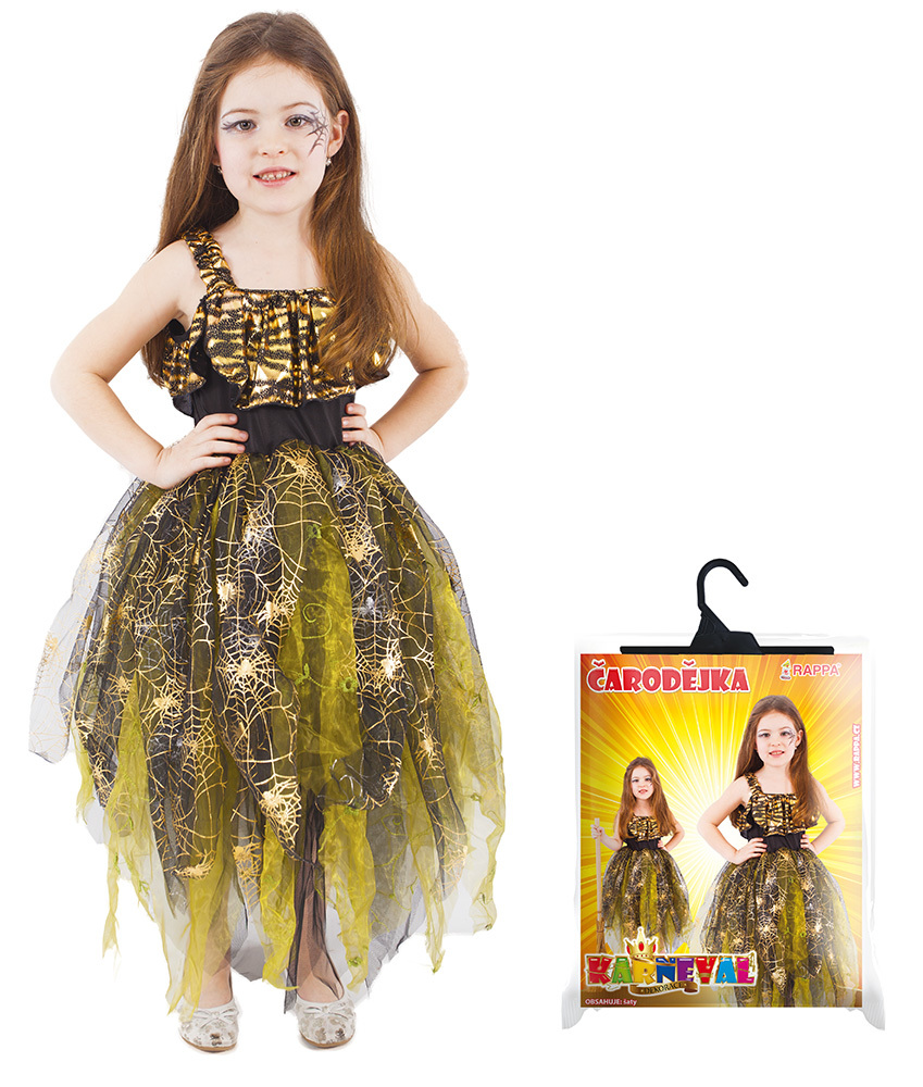 Karnevalový kostým čarodějnice v černo-zlaté barvě, zdobený pavučinkou. Ve velikosti M je určen pro holčičky ve věkovém rozmezí 6-8 let (116-128 cm). przeczytaj całość