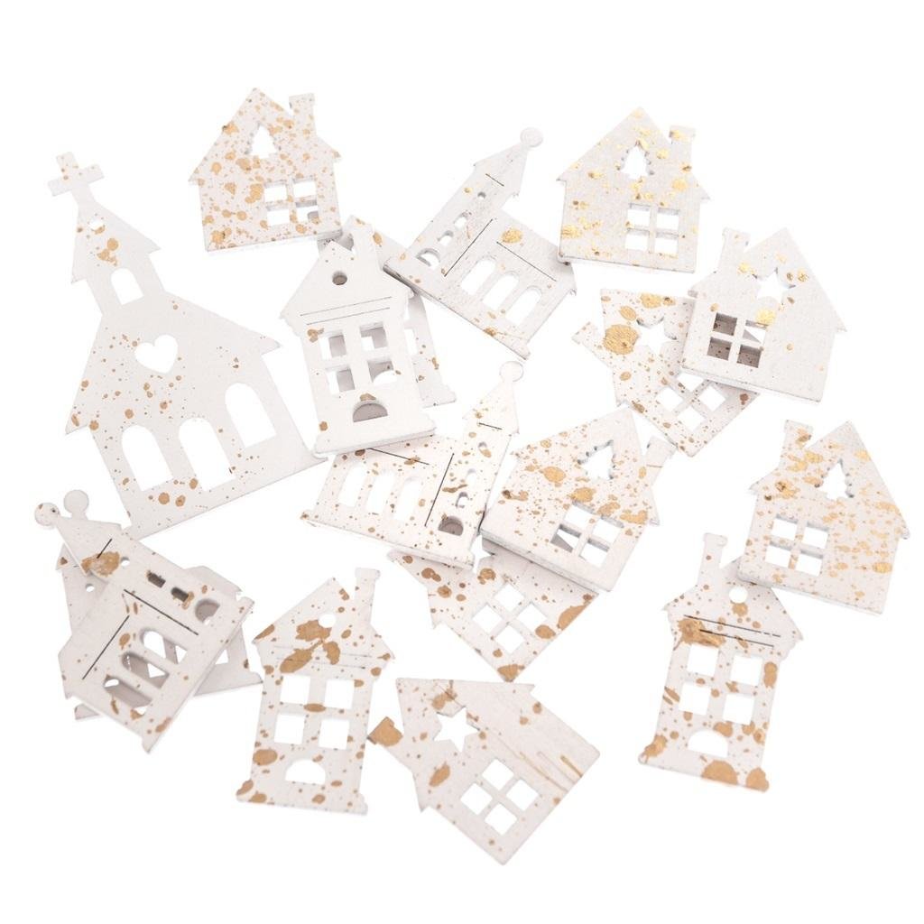 Białe, drewniane domki, posiadające ozdobne złocenia to stylowy dodatek do prac kreatywnych typu cardmaking, scrapbooking oraz home decor. Sprawdzą się doskonale przy zimowo-świątecznych projektach takich jak ozdoby choinkowe, wieńce, stroiki, czy opakowania prezentowe.