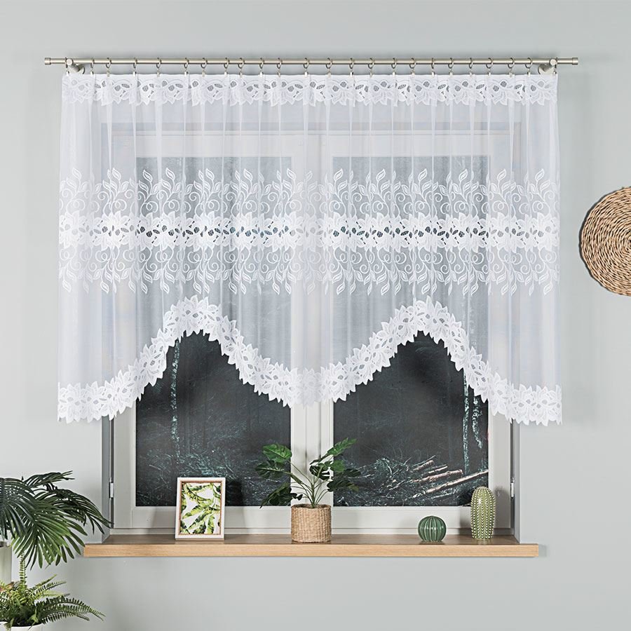 Wysokiej jakości krótka łukowa gotowa dekoracyjna firanka w nowoczesnym wykonaniu i stylu do sypialni lub salonu o wymiarze 300x120 cm. Firanka jest przygotowana do zawieszenia na żabkach. 1 sztuka w opakowaniu.