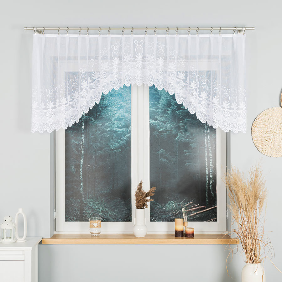 Wysokiej jakości krótka łukowa gotowa dekoracyjna firanka w nowoczesnym wykonaniu i stylu do kuchni. Firanka jest przygotowana do zawieszenia na żabkach. 1 sztuka w opakowaniu. przeczytaj całość