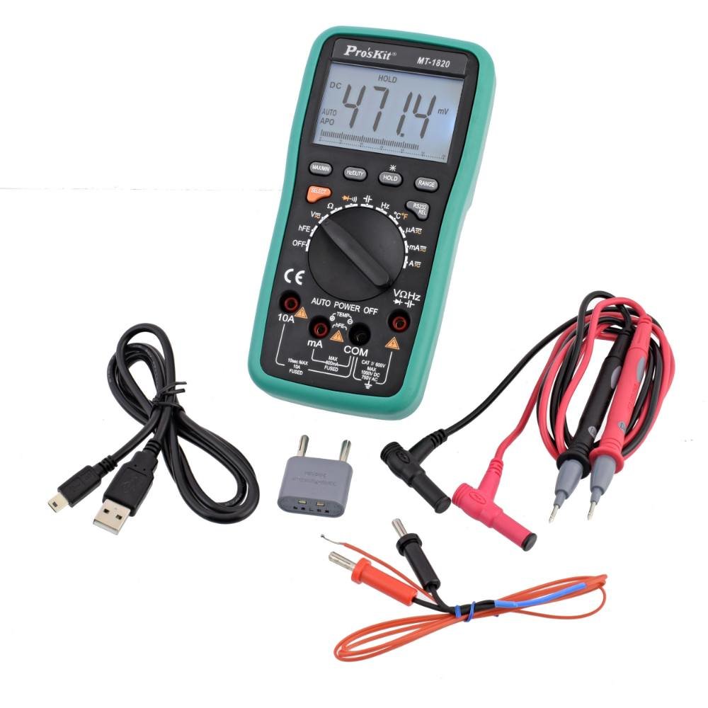 Profesionální digitální multimetr. Duální 3 5/6 displej a USB rozhraní.Měřící rozsahy:Vdc=600mV-1000V,Vac=6-750V,Idc=600uA-10A ,Iac= 600uA-10A,R=600Ohm-60MOhm,C=40nF-200uF, f= 100Hz-20MHz,t= -20-+1000°C.Další fce: tepl. v F,test diod a tranzistrů. rozhraní USB-komunikace softwaru a multimetru...