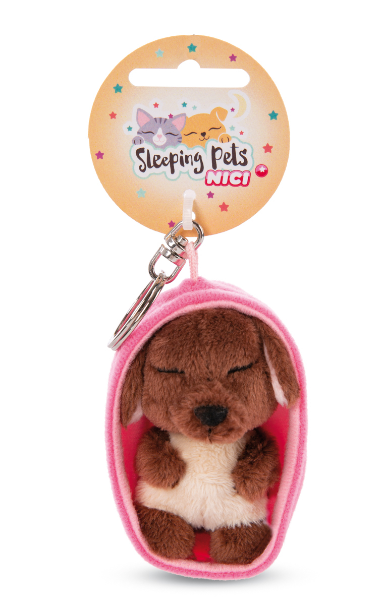 NICI klíčenka Spící pejsek 8cm hnědý, košík růžový