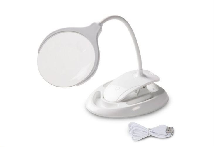 Zvětšovací sklo 3X / 8X:6 LED úsporná lampa s nastavitelnou úrovní jasu pomocí „dotykového“ spínače. Dlouhý dotyk vám místo toho umožní zvolit požadovanou úroveň jasu. Použitelné také jako stolní lampa.Dobíjecí baterie 400 mAh (součástí balení je nabíjecí kabel Micro USB). przeczytaj całość