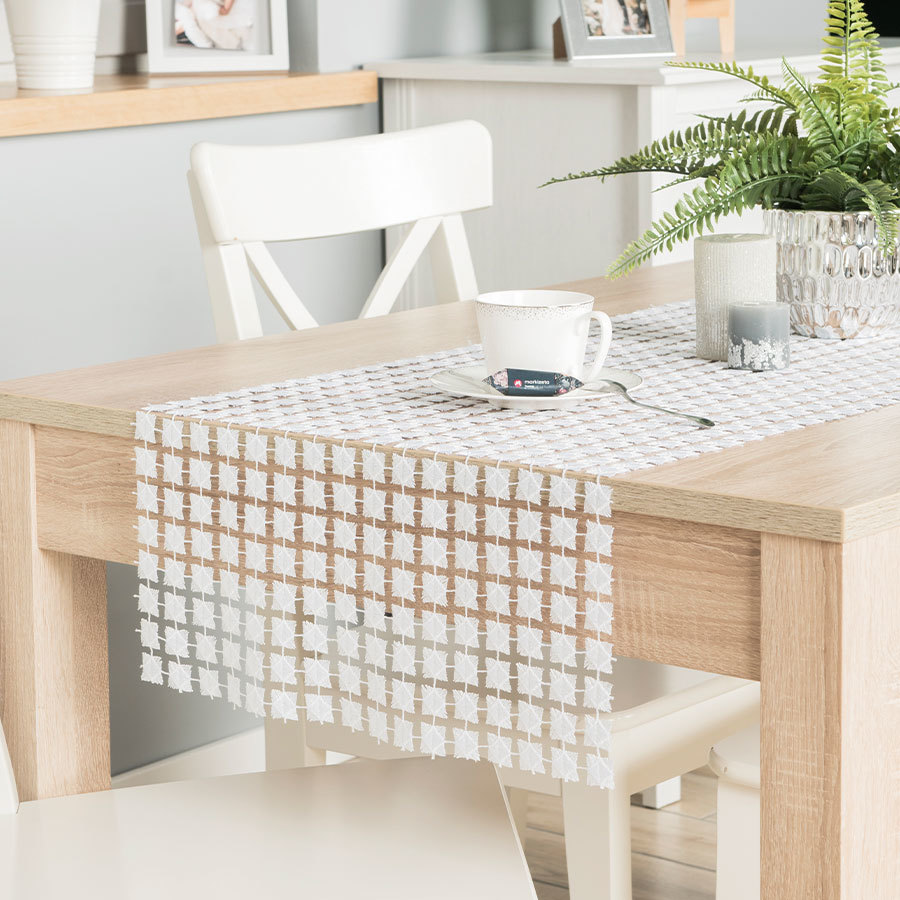 Kvalitní žakárový běhoun na stůl v moderním designu. Běhoun je nabízen ve velikosti 40x140 cm. Běhoun je odolný vůči nečistotám, neabsorbuje vodu. Běhoun je všestranným a stylovým doplňkem Vaší jídelny.  Krajkový běhoun je s lurexem. przeczytaj całość