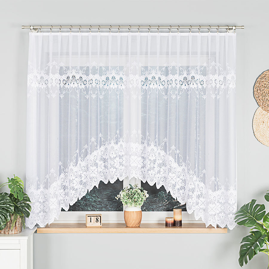 Kvalitní krátká oblouková hotová dekorační záclona v moderním trendovém provedení do kuchyně nebo obývacího pokoje. Záclona je připravena na zavěšení na žabky. 1 kus v balení.Rozměr : 1x 300x160 cm - šířka 300 cm, výška 160 cm przeczytaj całość