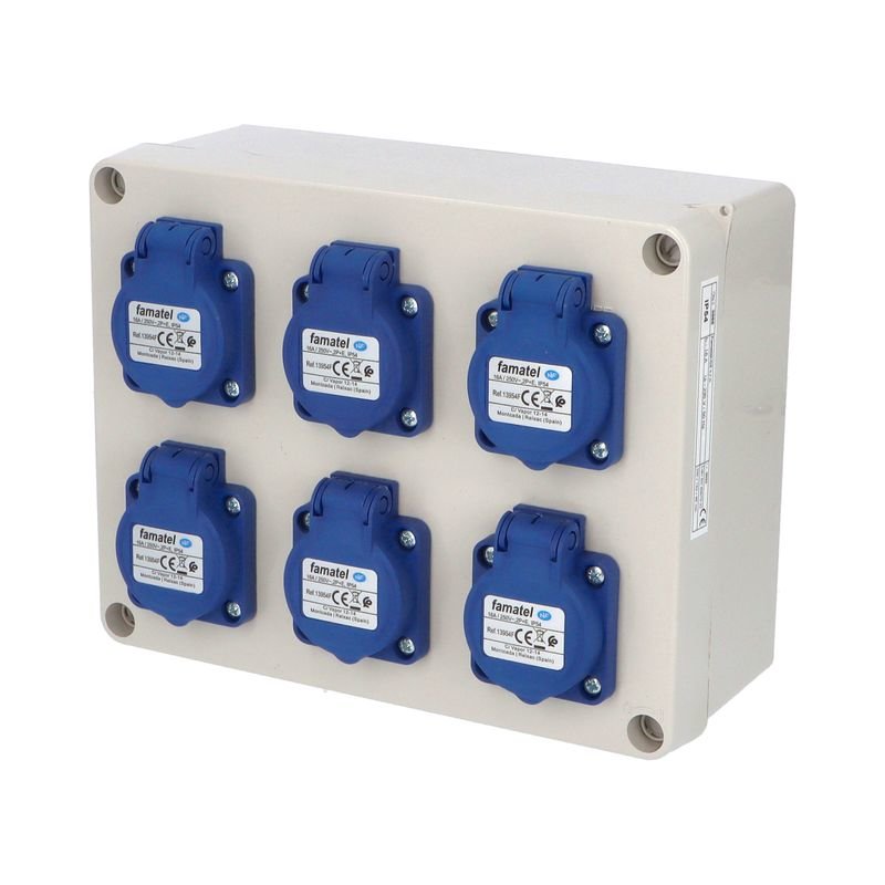 Puszka gniazdowa 3066 IP54 6x230V z bolcem ochronnym, 235x182x95mm, gładkie boki. Przygotowana do jednofazowego podłączenia za pomocą śrubowych zacisków.