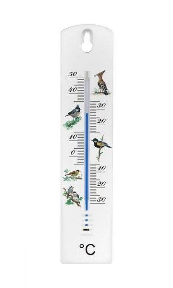 Vyrobeno z plastu. Měřítko na bílém pozadí, navíc zdobené barevnými ptačími tisky. Teplotní rozsah od -30 °C do + 50 °C. Tolerance až +/- 1 °C Použití: Teploměr může být použit uvnitř i venku (pokud minimální teplota nepřesahuje -30 °C). V horní části jsou opatřeny otvorem pro jejich upevnění....