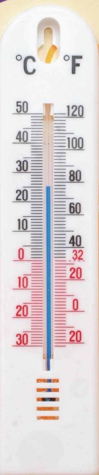 Właściwości produktu: Termometr z białego plastiku. Kapilara jest umieszczona głęboko w komorze obudowy. Temperaturę można odczytać w stopniach Celsjusza (skala po lewej) oraz Fahrenheita (skala po prawej). Zakres temperatur od -30 °C do +50 °C Tolerancja do +/- 1 °C Zastosowanie: Termometr może być używany wewnątrz i na zewnątrz (jeśli minimalna temperatura nie spada poniżej -20 °F lub -30 °C). W górnej części znajduje się otwór do zamocowania. Ponieważ jest wykonany z plastiku, może być stosowany w pomieszczeniach o bardzo wysokiej wilgotności.