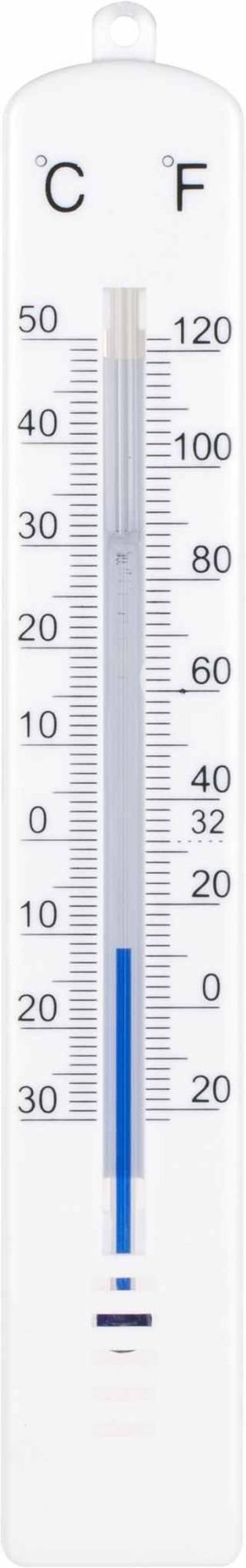 Teploměr z bílého plastu. Kapilára je uložena hluboko v dutině pouzdra. Teplota může být odečtena v stupních Celsia (levá stupnice) i Fahrenheita (pravá stupnice). Rozsah teplot od -30 °C do + 50 °C Tolerance chyby do +/- 1 °C Použití: Teploměr může být použit uvnitř i venku (pokud min. Teplota...