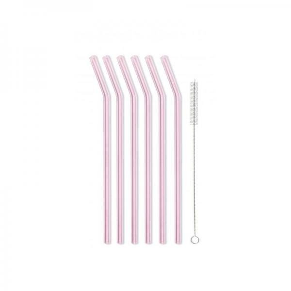 Vialli Design Skleněné brčko růžové, zahnuté 230 mm, 6 ks + kartáček, 6636