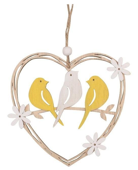 Ptáčci vyřezávaní ze dřeva v srdíčku na zavěšení 14 cm