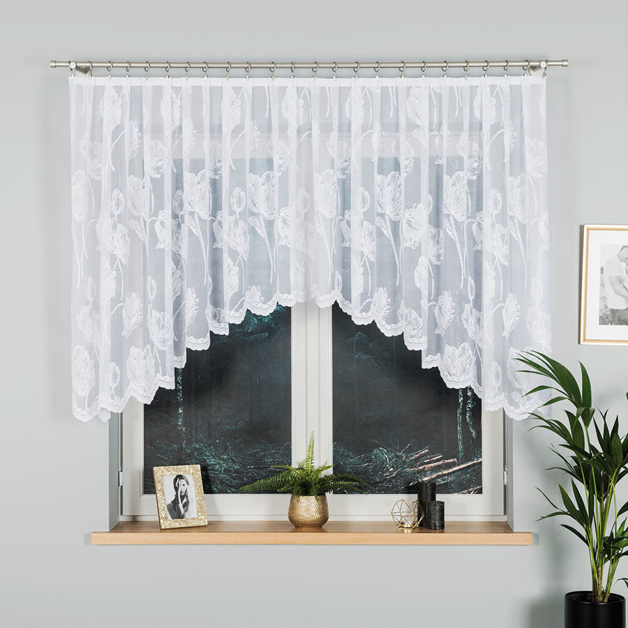 Wysokiej jakości krótka łukowa gotowa dekoracyjna zazdrostka w nowoczesnym, modnym wydaniu do kuchni lub salonu. Zazdrostka jest przygotowana do zawieszenia na żabkach. 1 sztuka w opakowaniu.