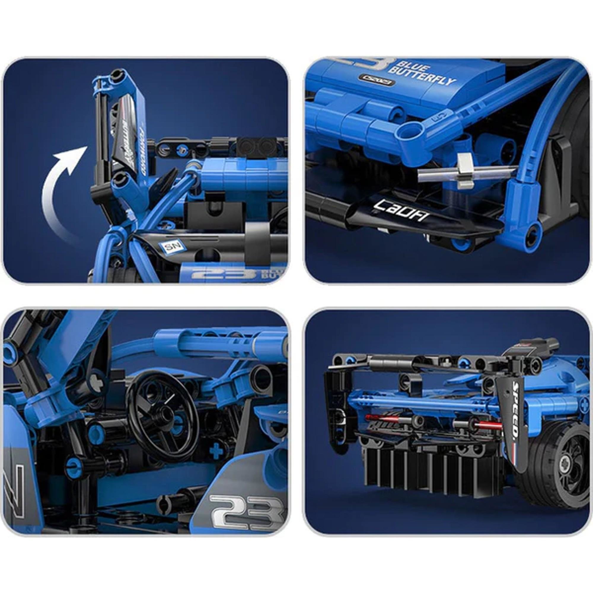 Klocki CADA. Samochód wyścigowy Shadow Sports Car Niebieskie auto sportowe Wyścigówka z napędem