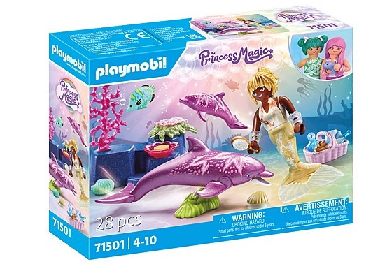 Syrenka z delfinami Syrenka opiekuje się rodziną delfinów. Z małym delfinem i ozdobną muszlą do przymocowania na gładkich powierzchniach (wraz z przyssawką). Dołącz do syrenki podczas jej przygód w olśniewającym podwodnym świecie PLAYMOBIL. Opieka nad morskimi stworzeniami jest jednym z...