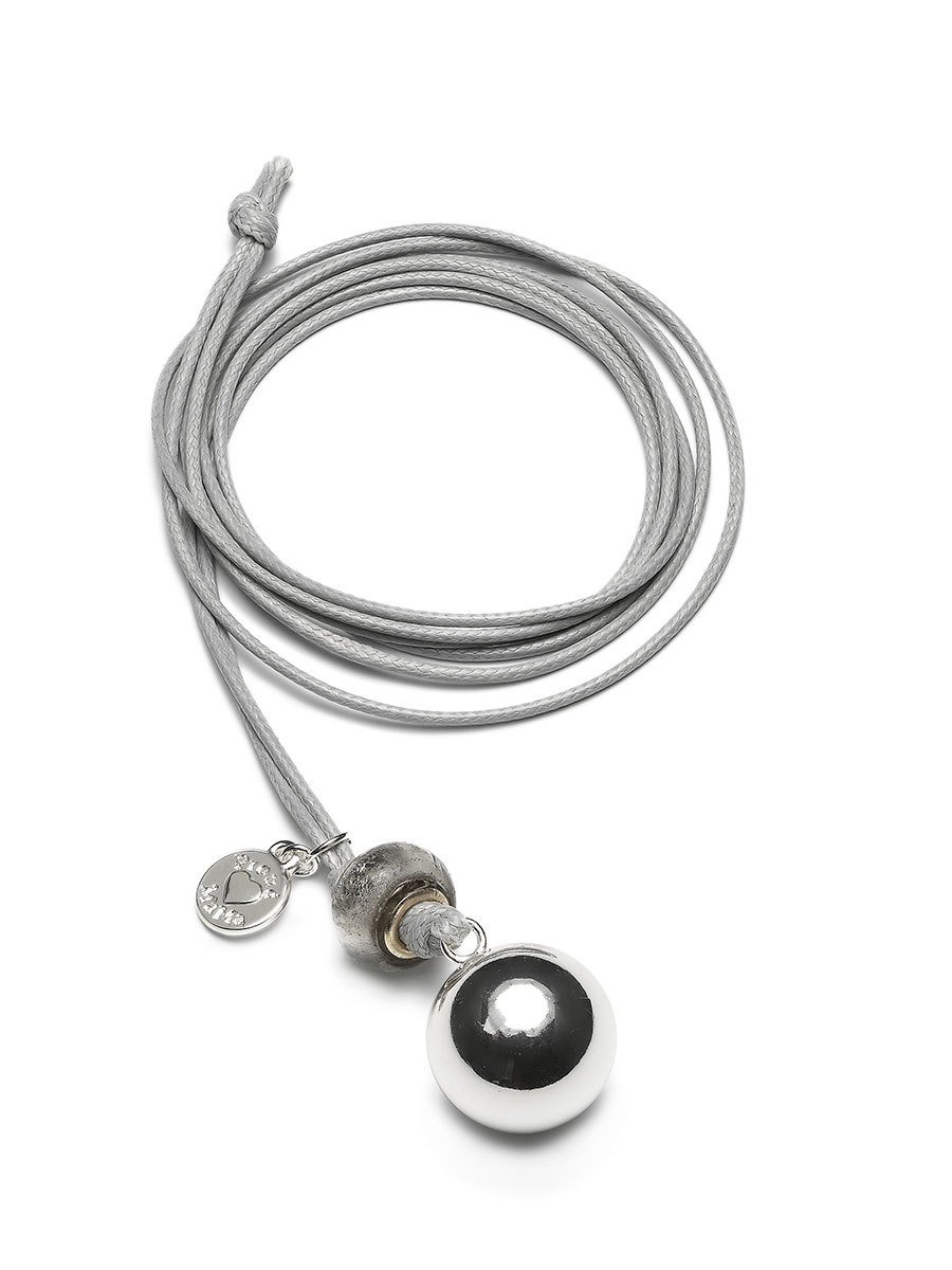 Mexická bola – kulička, barva stříbrná, materiál kov / šňůrka, délka 120 cm, váha 15 g. Miminko v bříšku vnímá zvuky už od 20. týdne těhotenství. Jemné cinkání na bříšku má uklidňující účinky jak na maminku, tak hlavně pro miminko. Po narození miminka lze bolu pověsit do jeho blízkosti, do...