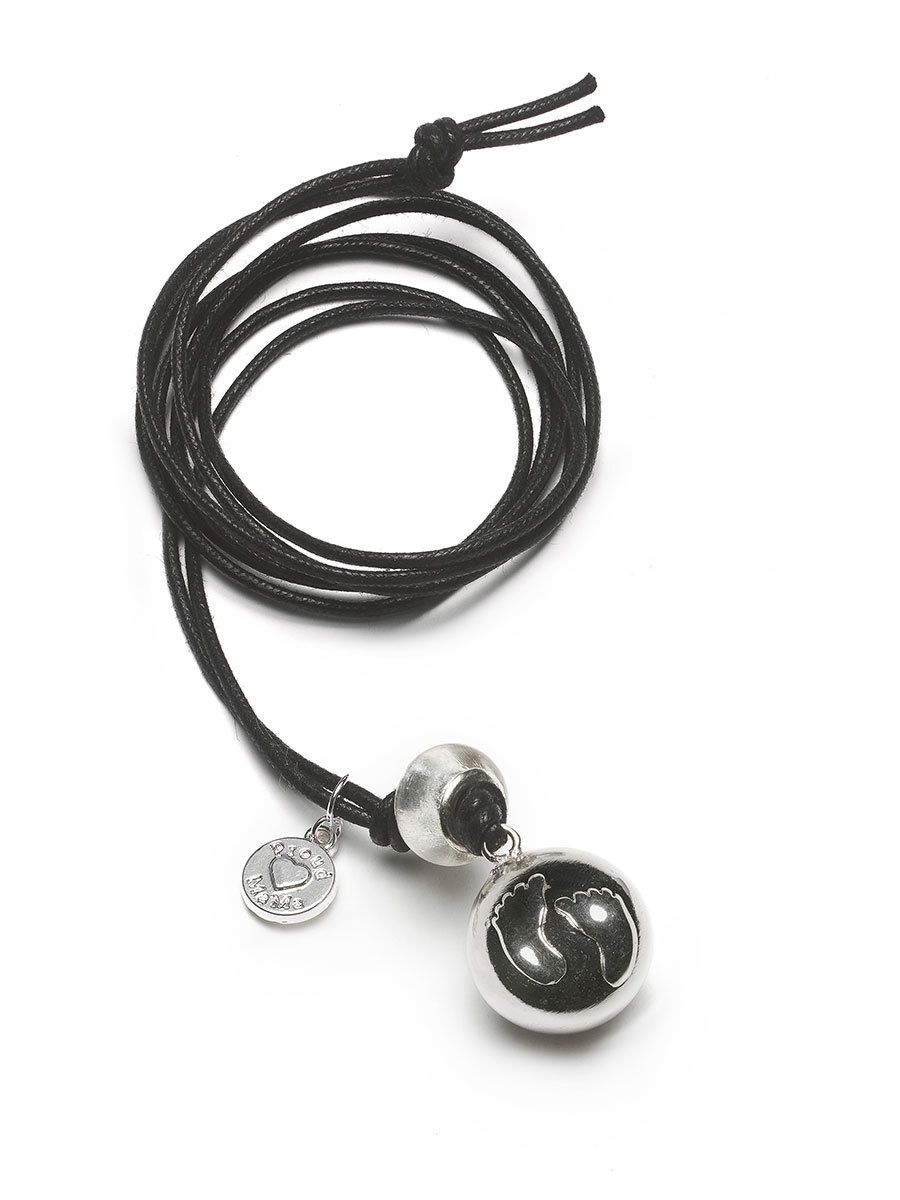 Mexická bola – kulička s dětskou nožičkou, barva černá / stříbrná, materiál kov / šňůrka, délka 120 cm, váha 15 g. Miminko v bříšku vnímá zvuky už od 20. týdne těhotenství. Jemné cinkání na bříšku má uklidňující účinky jak na maminku, tak hlavně pro miminko. Po narození miminka lze bolu pověsit...