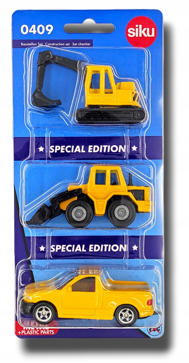 Stavební set SIKU - bagr, pick-up auto, nakladač. Rozměry: 9,5x20x4 cm. Věk 3+ przeczytaj całość