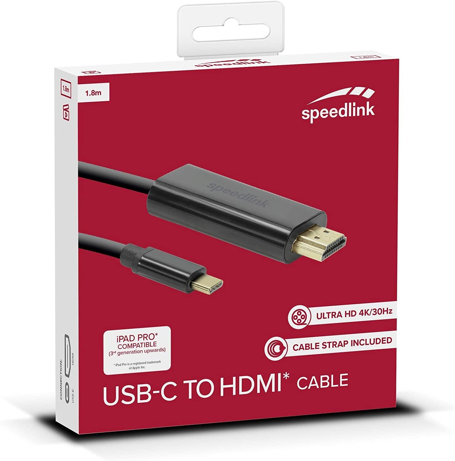 Speedlink USB-C to HDMI cable, 1.8M HQ (SL-180026-BK)Vlastnosti:Umožňuje spolehlivý přenos videosignálu bez rušení díky pozlaceným kontaktům.Kompatibilní s DisplayPortem, alternativním režimem a rozhraním Thunderbolt 3.Kabel umožňuje přenos videa v Ultra-HD nebo 4K (30 Hz).Součástí sady je kabel...