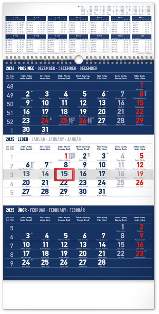 Kalendář 2025 nástěnný: 3měsíční standard modrý - s ročním přehledem, 29,5 × 43 cm (czeski)