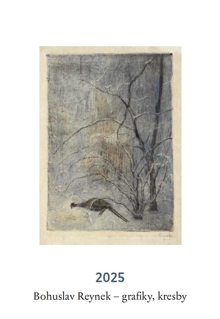 Nástěnný kalendář s grafickými listy a kresbami Bohuslav Reynka. Bažant v zimě (kolorovaná suchá jehla s monotypem, 1947), Sníh IV (suchá jehla, tužka, 1941), Veronika s Kristem II (kolor. lept a suchá jehla s monotypem, 1950), Ovce v zimě (suchá jehla, 1950), Pieta s rybami (suchá jehla s...