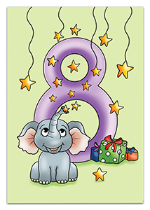 Kartka na 8. urodziny ze słonikiem. Kartka wewnątrz jest ozdobiona motywami z okładki z tekstem "Wszystkiego najlepszego z okazji urodzin!". Pakowana w białą kopertę. Wymiary 19,5x13,5 cm. przeczytaj całość