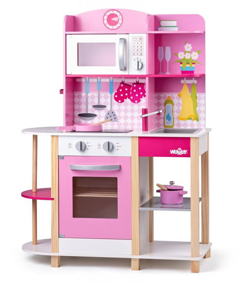 Kuchyňský ostrov nadchne malé hospodyňky něžným designem i věrohodným provedením. Ostrov obsahuje klasickou i mikrovlnnou troubu, odkládací prostory, dřez s baterií a velké množství kuchyňského náčiní. Pro maximální požitek ze hry mají spotřebiče otevírací dvířka a jejich knoflíky jsou otočné,... przeczytaj całość