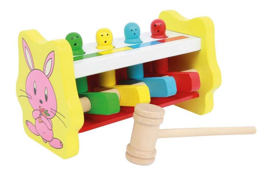 Každým zásahem stoupá nálada. Zasuňte figurky do barevně odpovídajícího otvoru, uhoďte do páky dřevěnou paličkou (13,5 x 4,5 x 2,5 cm) a figurky vyletí do vzduchu. Barevně lakované dřevo školí rozpoznání barev a motorické dovednosti a stále nová radost ze hry podporuje učení.Německá firma Legler...