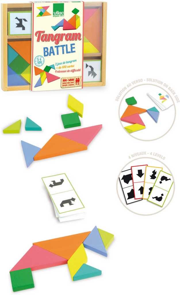 Kto jako pierwszy ułoży tangram zgodnie z obrazkiem na kartoniku, wygrywa! Gra zawiera ponad 100 kart i ma 4 poziomy trudności. Opakowanie zawiera dwa zestawy tangramów i kartoniki z sylwetkami. Gra jest odpowiednia dla 1-2 graczy w wieku od 5 do 100 lat. Zabawki Vilac posiadają znak francuskiej agencji ADEME, co oznacza, że te drewniane zabawki są wytwarzane ekologicznie. Oszczędzają środowisko, nie zanieczyszczają gleby, wody i powietrza oraz nie marnują energii. Od ponad 100 lat marka Vilac spełnia dziecięce marzenia. Firma Vilac ma siedzibę głęboko w sercu masywu Jury, otoczona górami, jeziorami i lasami. Ta francuska firma produkuje od 1911 roku drewniane zabawki w klasycznym, dawno zapomnianym stylu, z nowoczesnymi kolorami i wzorami. Zabawki Vilac są wyjątkowe, nigdy nie wychodzą z mody i potrafią oczarować wszystkie pokolenia. Vilac pomaga kształtować dziecięcą wyobraźnię swoimi radosnymi ilustracjami i wzornictwem oraz reinterpretacją klasycznych zabawek, które się nie zużywają. Dzieci dostają na Boże Narodzenie i urodziny mnóstwo zabawek, jednak większość z nich nie zajmuje ich na długo - miłość do zabawki nie trwa. Drewniane zabawki Vilac wzbudzają pasję nawet po 50 latach, gdy jako dorośli przypadkowo znajdziemy na strychu zabawki, które kochaliśmy jako dzieci. Vilac od 100 lat łączy dzieci z zabawkami, które pokochają i których będą świadomi wartości. A dlaczego dzieci je tak kochają? To pozostaje tajemnicą firmy Vilac.