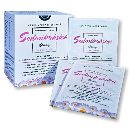 BeautyDrink Sedmikráska Orling je originální doplněk stravy pro optimální péči o každý typ pleti. Vyživuje pokožku obličeje i těla, je zdrojem látek s nutričním i fyziologickým účinkem, doplňuje běžnou stravu o biologicky aktivní látky, lze jej užívat ke komplexní výživě pleti, vlasů a nehtů zevnitř. Stimuluje cílenou syntézu kolagenu v pokožce.