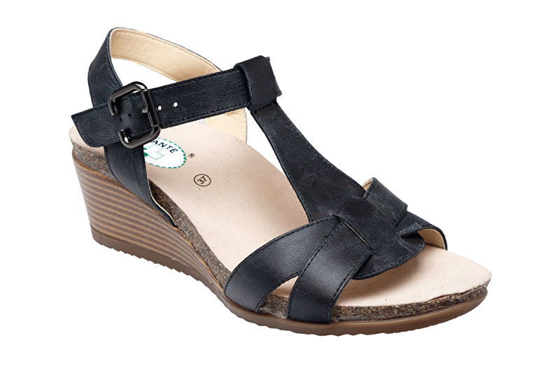Zdravotní obuv - dámské vycházkové sandále,barva: černá, podrážka: béžová,svrchní materiál: kůže,stélka: kůže,klínek cca 5,5 cm,pásek kolem paty lze nastavit pomocí spony,vpředu elegantní zkřížení kožených pásků. przeczytaj całość