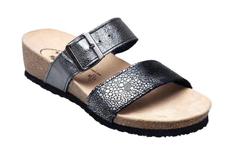 Zdravotní obuv - dámské pantofle,barva: černá s metalickým odleskem, vzor,podešev: černá,stélka: anatomicky tvarovaná, kožená,materiál: kůže,zapínání na přezku. przeczytaj całość
