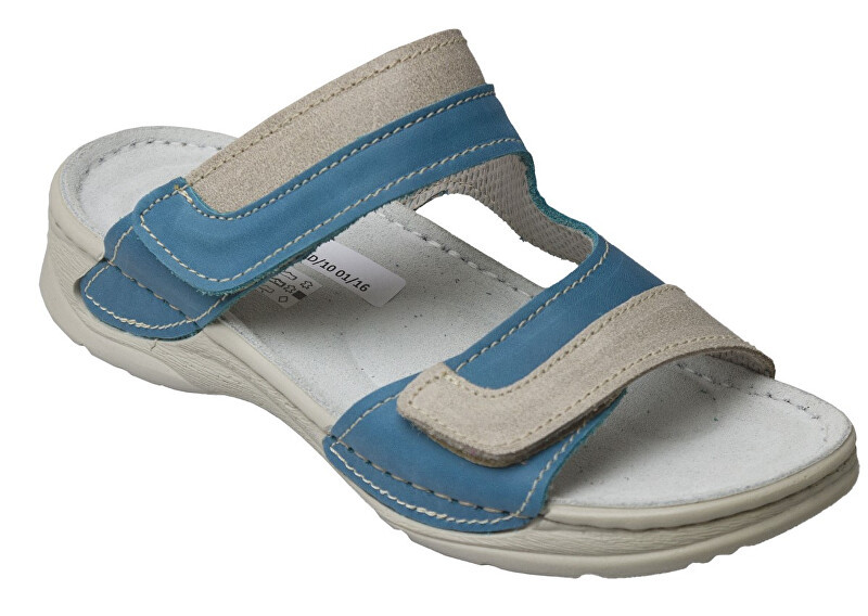 Zdravotní obuv - dámské pantofle,barva: tyrkysová, béžovápodešev: bílá stélka: anatomicky tvarovaná, kožená,materiál: kůže,přezky pro upravení velikosti,protiskluzová podešev,certifikovaná obuv. przeczytaj całość