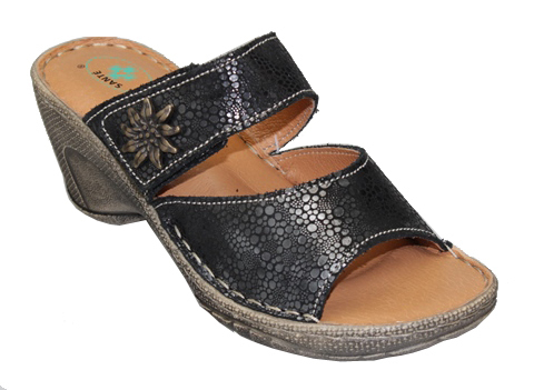 Zdravotní obuv - dámské pantofle,barva: černá,podešev: tmavá, na klínku cca 6,5 cm,svrchní materiál: kůže,stélka: kůže, anatomicky tvarovaná včetně "srdíčka",nastavitelný pásek přes nárt. przeczytaj całość