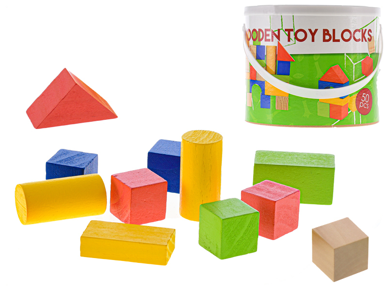 - Zawiera 50 sztuk kolorowych drewnianych klocków.