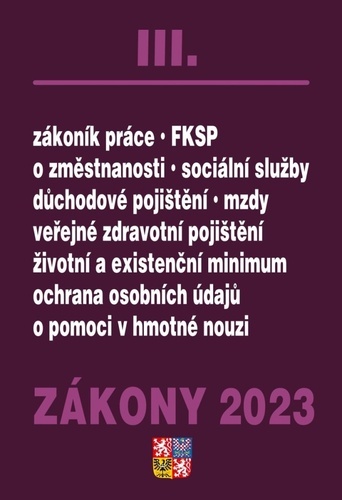 Zákony III obsahují právní předpisy pro oblast zákoníku práce, mzdových a platových předpisů, zaměstnanosti, pojištění, veřejného zdraví. Všechny právní předpisy obsahují novely zákonů schválených během roku 2022 k právnímu stavu 1. 1. 2023. Je rozdělena do 5. kapitol – Zákoník práce, Mzdové a...