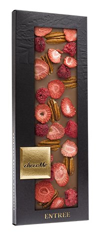 Mléčná čokoláda s pekanovými ořechy, plátky jahod a celými malinami